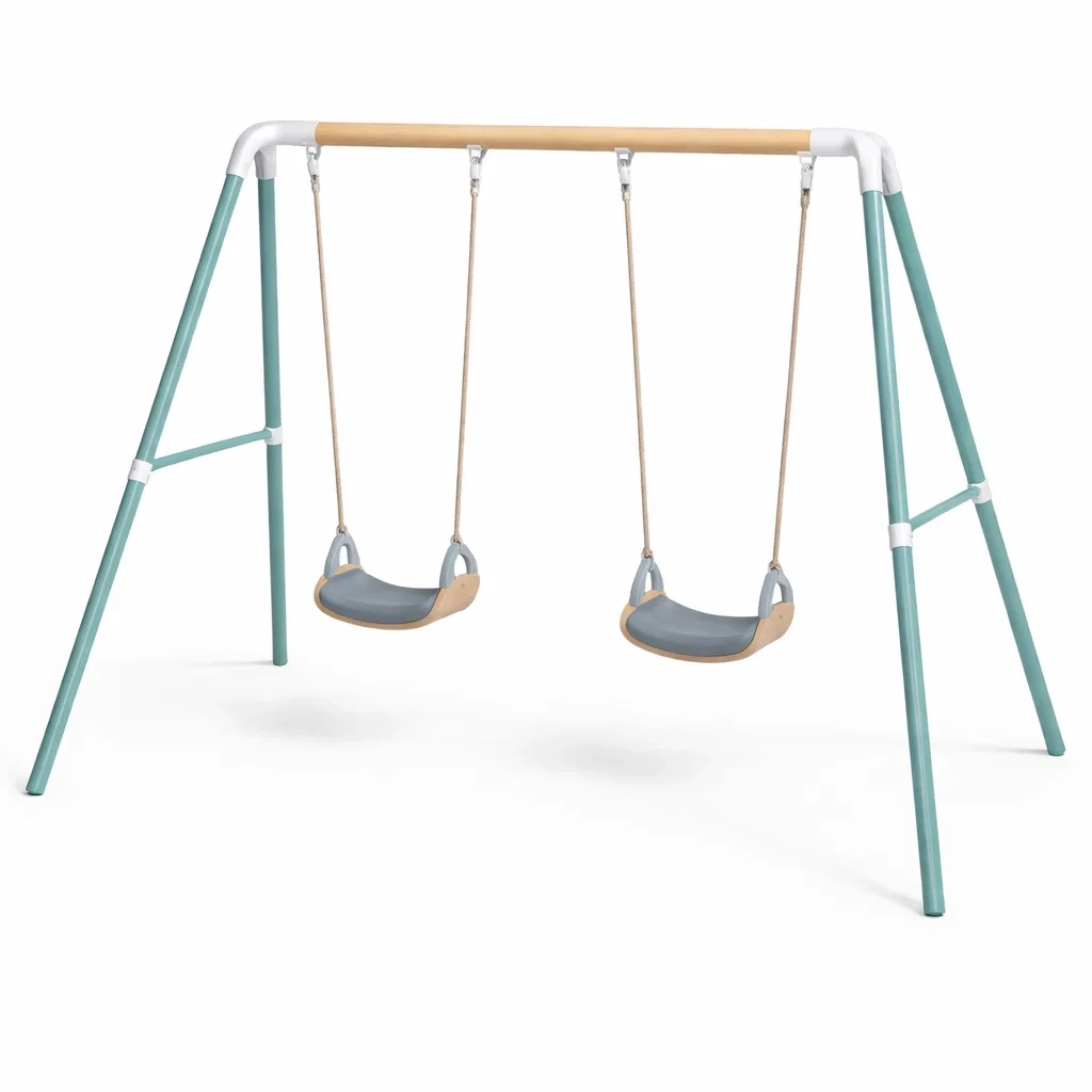 Ensemble de balançoires double en métal et bois gris et turquoise