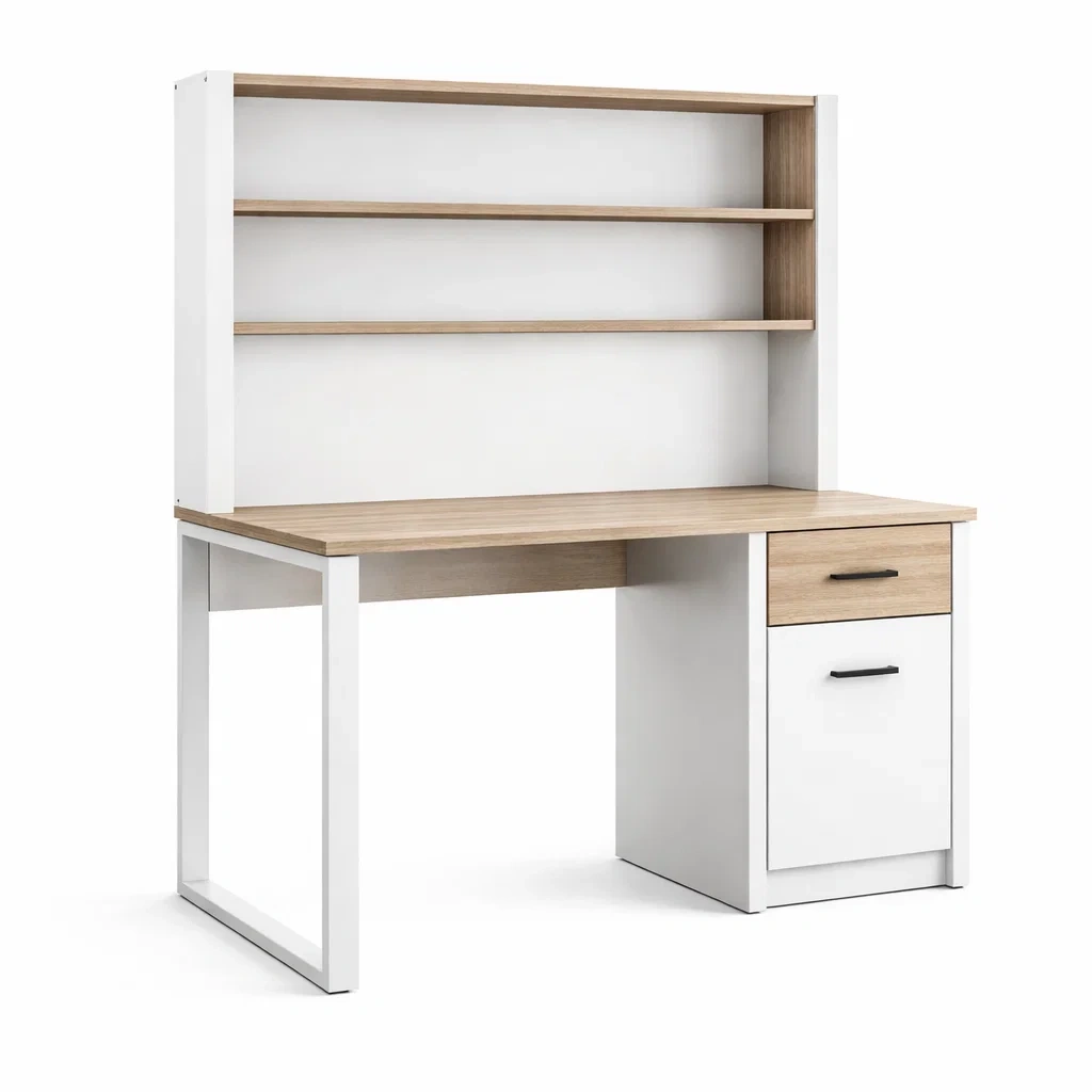 Ce bureau est fabriqué en MDF avec des finitions en Blanc et Chêne. Il est équipé de deux étagères ouvertes, d'un tiroir et d'un placard pour un rangement optimal. Le cadre est en métal robuste pour assurer la solidité. Sa surface de travail mesure 120 cm de long, 60 cm de large et la hauteur totale est de 145 cm. Charge maximale: 50 kg.