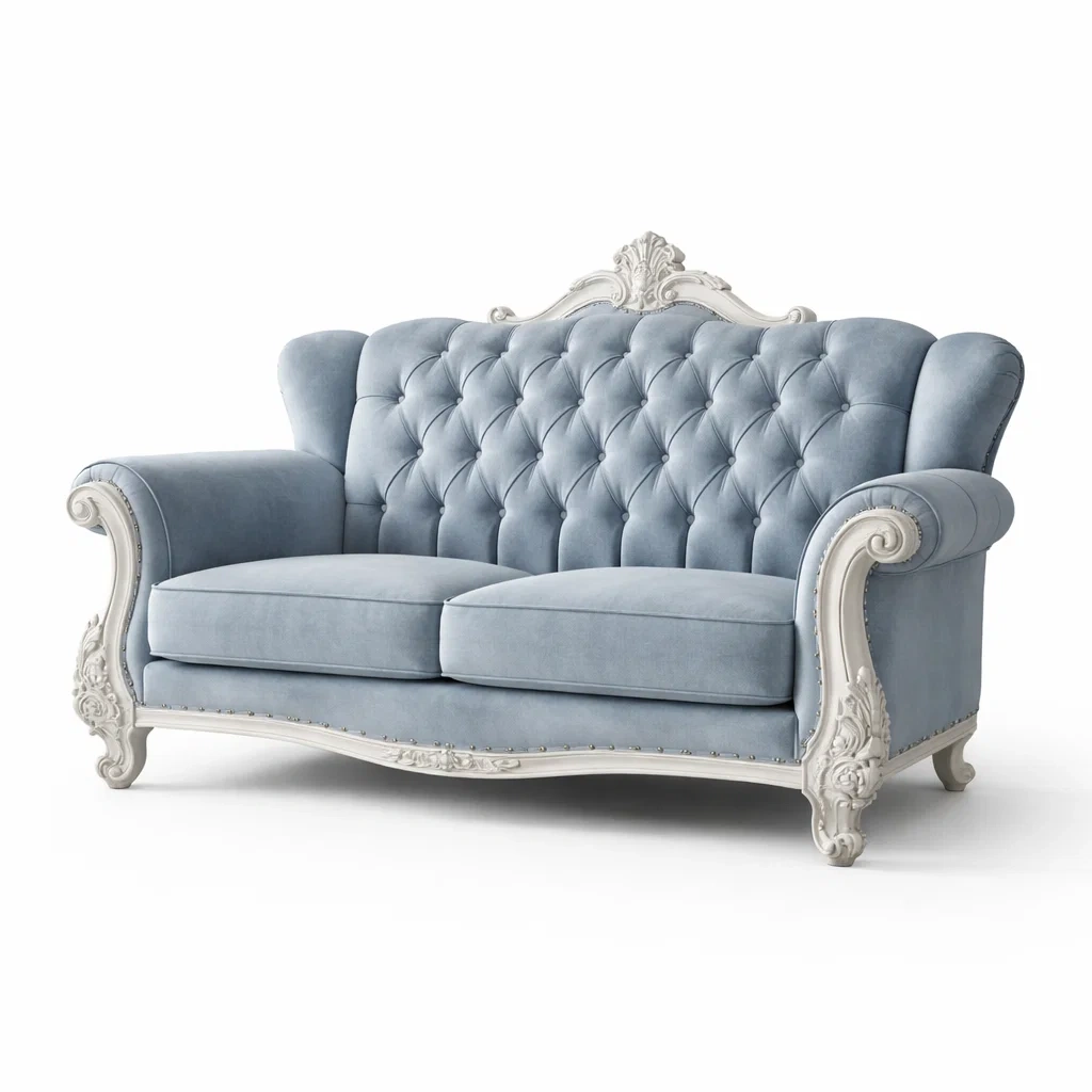 Ce canapé deux places est recouvert de velours, offrant une sensation douce et confortable. La structure est en bois massif sculpté, ajoutant une touche d'élégance. Le rembourrage est fait de mousse haute densité pour un soutien optimal.