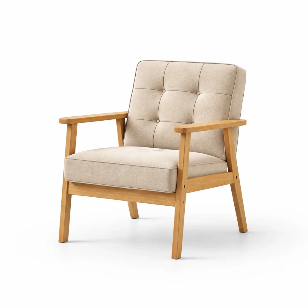 Ce fauteuil est conçu avec un cadre en bois de chêne et un revêtement en tissu polyester. La couleur principale est Beige.